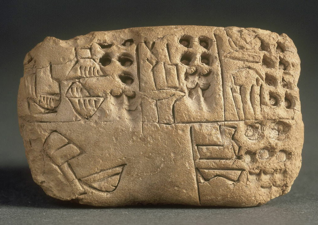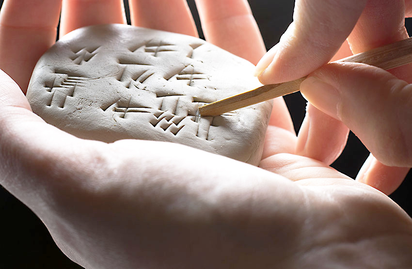 Les scribes utilisaient un calame (roseau taillé en pointe) pour graver des signes sur des tablettes d’argile. Cette écriture, appelée cunéiforme, reposait sur des pictogrammes représentant des objets, des lieux ou des concepts.
